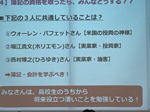 高校で習った簿記の知識を知っていることで実社会に出た時に一歩リードしているとお話いただき、大変有意義な時間となりました。