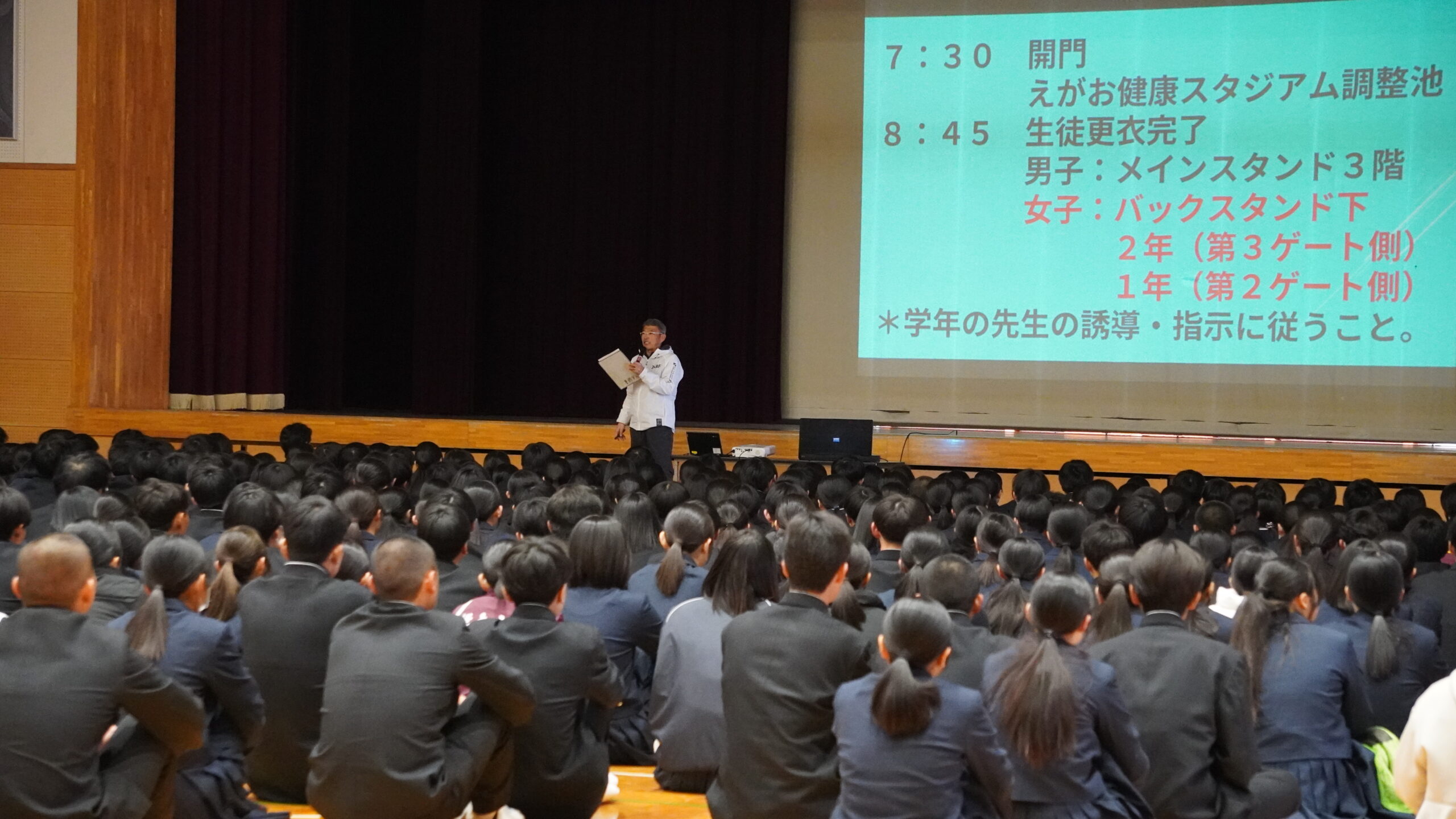 今日は、体育館に全校生徒が集まり明日に向けての事前指導がありました。