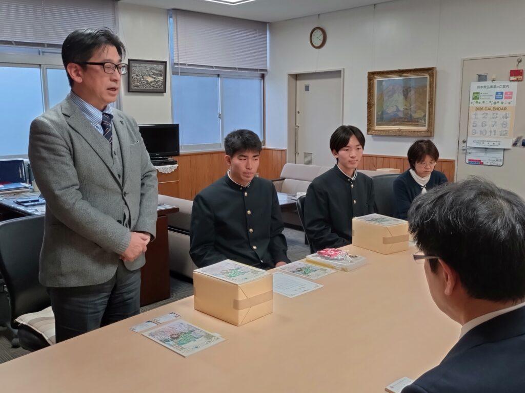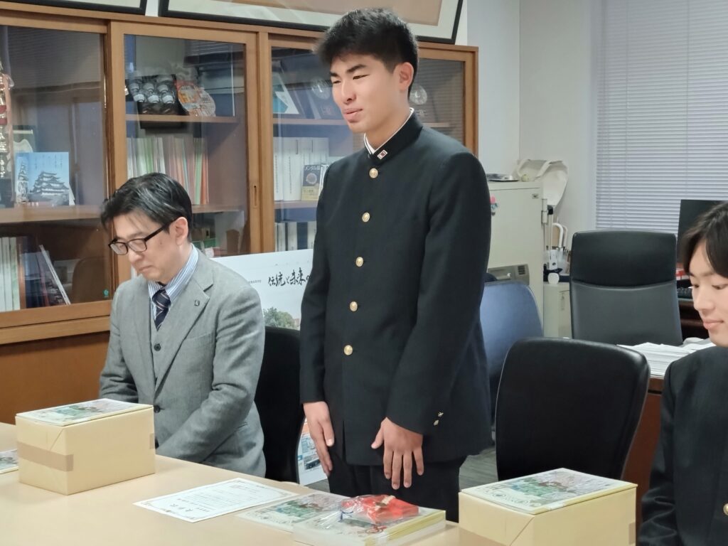 本校からは、生徒会長の森岡さんが代表で受け取り、「紙ならではの良さを感じながら使っていきます」と感謝の言葉を述べてくれました。